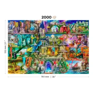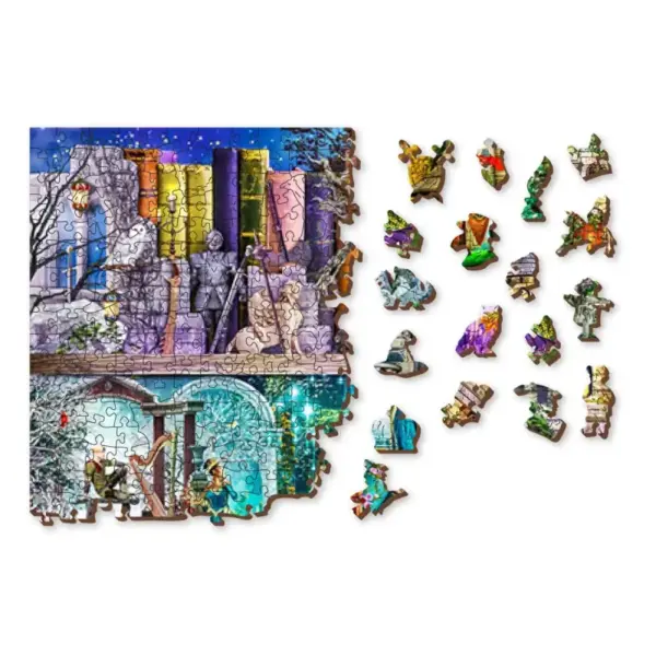 Detaliile extraordinare ale imaginii reprezintă o provocare deosebită: scene minuscule, personaje colorate și tranziții subtile așteaptă să fie asamblate piesă cu piesă. În puzzle elemente cu o formă unică (capricioasă) personaje de basm, cărți, dragoni și alte forme tematice, care sporesc experiența și oferă o surpriză jucăușă în timpul puzzle-ului.