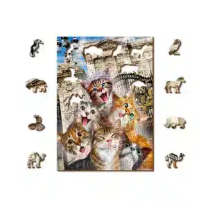 A 200 különböző darabot tartalmazó puzzle egy szelfi pillanatot megörökítő játékos macskák jelenetét festi meg. Ezek a vigyorgó és pimaszul nyelvüket kidugó macskák a Buckingham-palota pompájával szemben elevenednek meg. A koronát egy különleges cica teszi fel, királyi díszben!