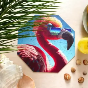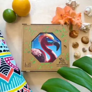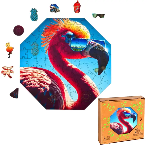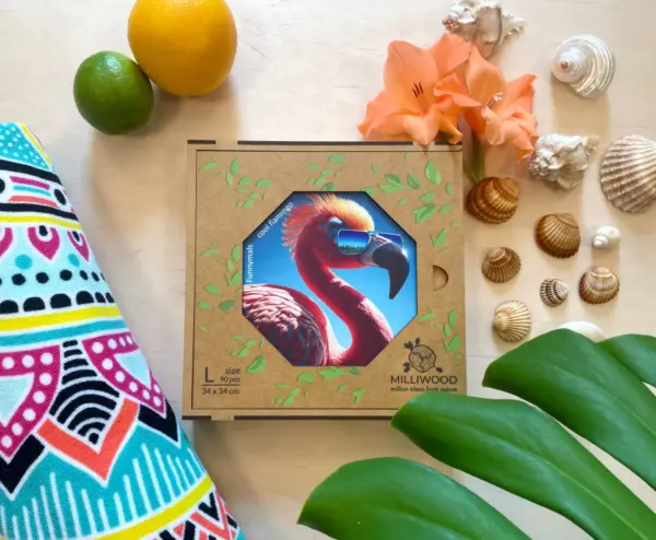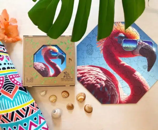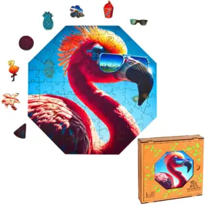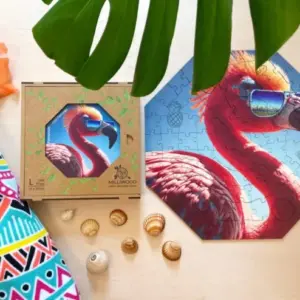 Cool Flamingó rendszeres fellépője a Hippy hörcsög által szervezett nyári fesztiváloknak, ahol nemcsak a flamingók, hanem minden állat a zenéjére bulizik hajnalig. Ez a vibráló, fesztiválos hangulat köszön vissza ebben a látványos, színes în puzzle din lemn is.
