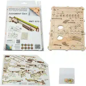 A Fegyver 3D fa puzzle – Ítélet napja RMT‑870 prémium minőségben készül, minden részlete pontosan kidolgozott: markolat, cső, elsütő szerkezet – a formavilág hűen visszaadja a valódi puskát, miközben műanyag helyett fenntartható, környezetbarát nyírfával készült .