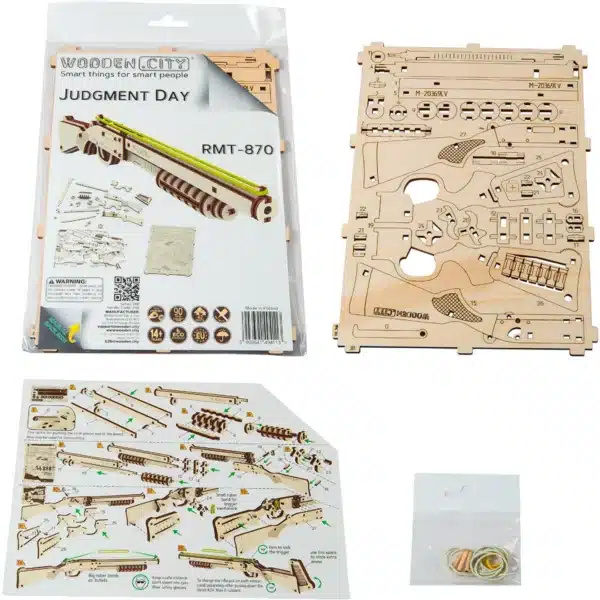 A Judgment Day RMT‑870 3D fa puska puzzle ötvözi a kreatív építést, a finom mechanikát és a játék élményét egy elegáns, fenntartható termékben. Legyél te is tulajdonosa ennek a gumiszalagos fa fegyvernek, építsd meg, használd, és élvezd a mérnöki precizitás és működő mechanizmus harmóniáját!