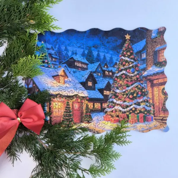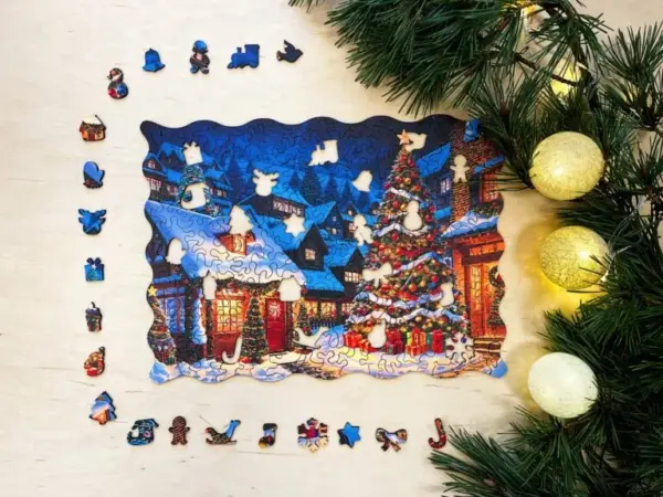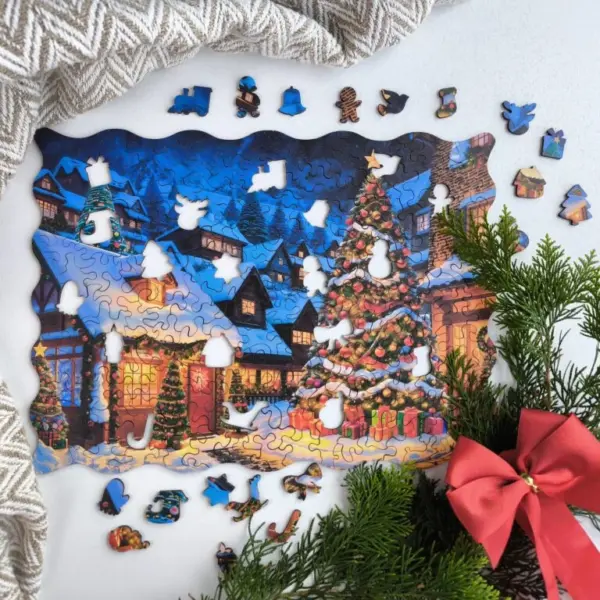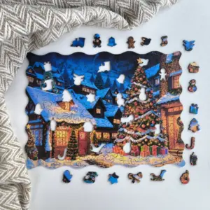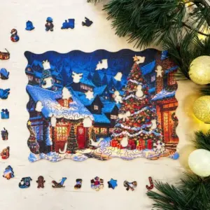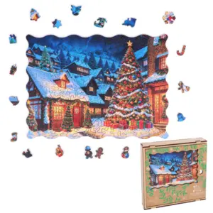 A Karácsonyi Falu fa puzzle egy olyan ünnepi jelenetbe repít, ahol minden részlet a karácsony meghittségét és békés hangulatát idézi. A hóval borított kis házak, a csillogó fényekkel feldíszített fenyőfák, az utcákon megcsillanó meleg, sárgás fényáradás és a távolban húzódó téli hegyek egy varázslatos világot keltenek életre – olyan tájat, ahol az ember szinte érzi a friss hó illatát és hallja a csendes ünnepi neszeket. A puzzle nem csupán egy kép, hanem egy olyan élmény, amely minden kirakással újra meg újra előhívja a karácsony gyermekkori varázsát.