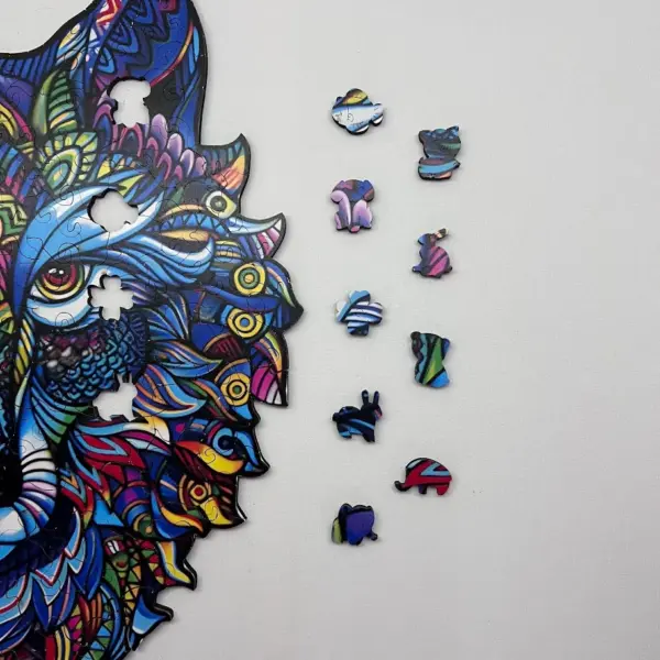 A farkas évezredek óta a szabadság, a lojalitás és az ösztönös tudás jelképe. A Misztikus farkas fa puzzle ezt a szellemiséget kelti életre: minden szín, minden minta és minden fa darab egy újabb rétege ennek a történetnek. A szivárványszerű árnyalatok az emberi érzelmek sokféleségét, a geometrikus díszítések pedig a természet rendjét és harmóniáját tükrözik.