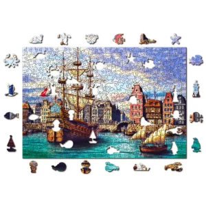 Ez a puzzle egy kikötőben lévő régi hajók magával ragadó ábrázolása, a háttérben fenséges ősi házakkal, egy kőhíddal és gyönyörű kék vízzel vár téged ez az egyedi darab.