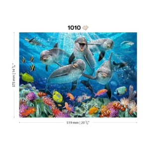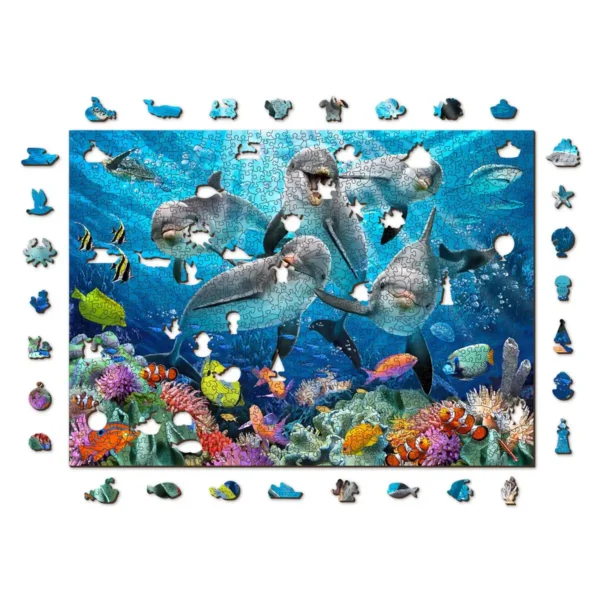 Ez a fa puzzle egy lélegzetelállító víz alatti utazásra visz. A tengeri tájkép középpontjában csillogó mosolyú delfinek ragadják meg az öröm lényegét, amint egy elbűvölő víz alatti szelfihez pózolnak. Nincsenek egyedül. Halak sokasága száguld el mellettük, ragyogó színekben, bonyolult korallformációk és sodródó hínár mellett.