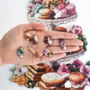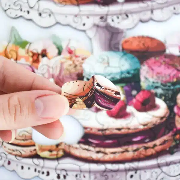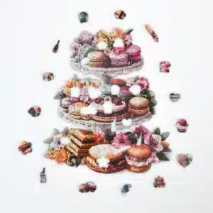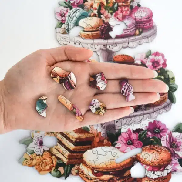 Az édesség és az elegancia találkozik ebben a színes fa kirakóban, amely tele van macaronokkal, süteményekkel és virágzó növényekkel. Fedezz fel bájos formákat, mint csészék, sütik és még sok más! Ez a fa kirakó gyorsan a kedvenceddé válik!