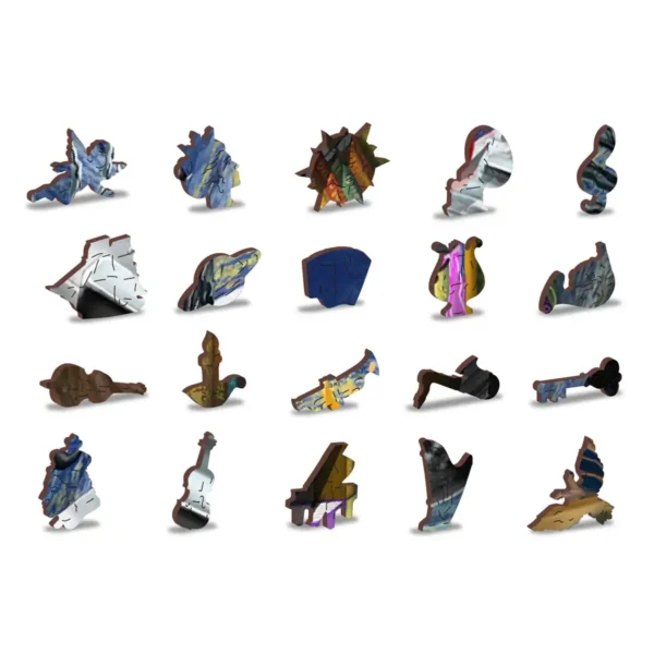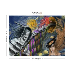 Merülj el mélyen a narratívában, amelyet ez a fa puzzle kibontakoztat. Egy lány, akinek a feje gramofonná változott, ragyogó színek sokaságát engedi szabadjára, miközben egy másik lány önfeledten táncol.