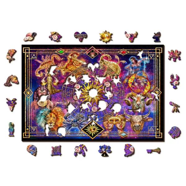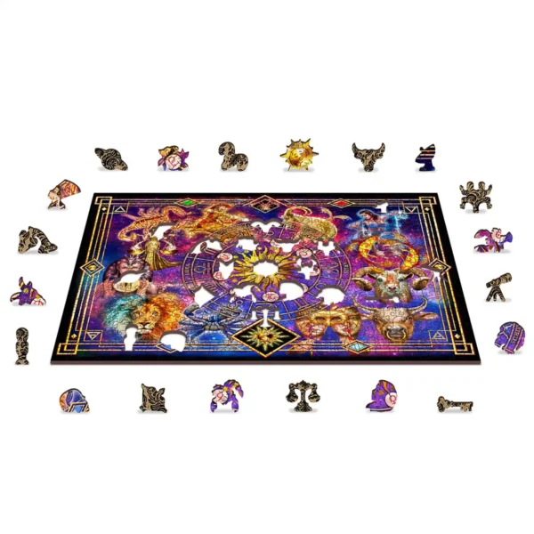 A Zodiákus montázs fa puzzle az állatöv összes csillagjegyét bemutatja egy lenyűgöző kozmikus háttér előtt. A zodiákus montázs egy feltűnő összeállítást mutatbe, tele színes árnyalatokkal.